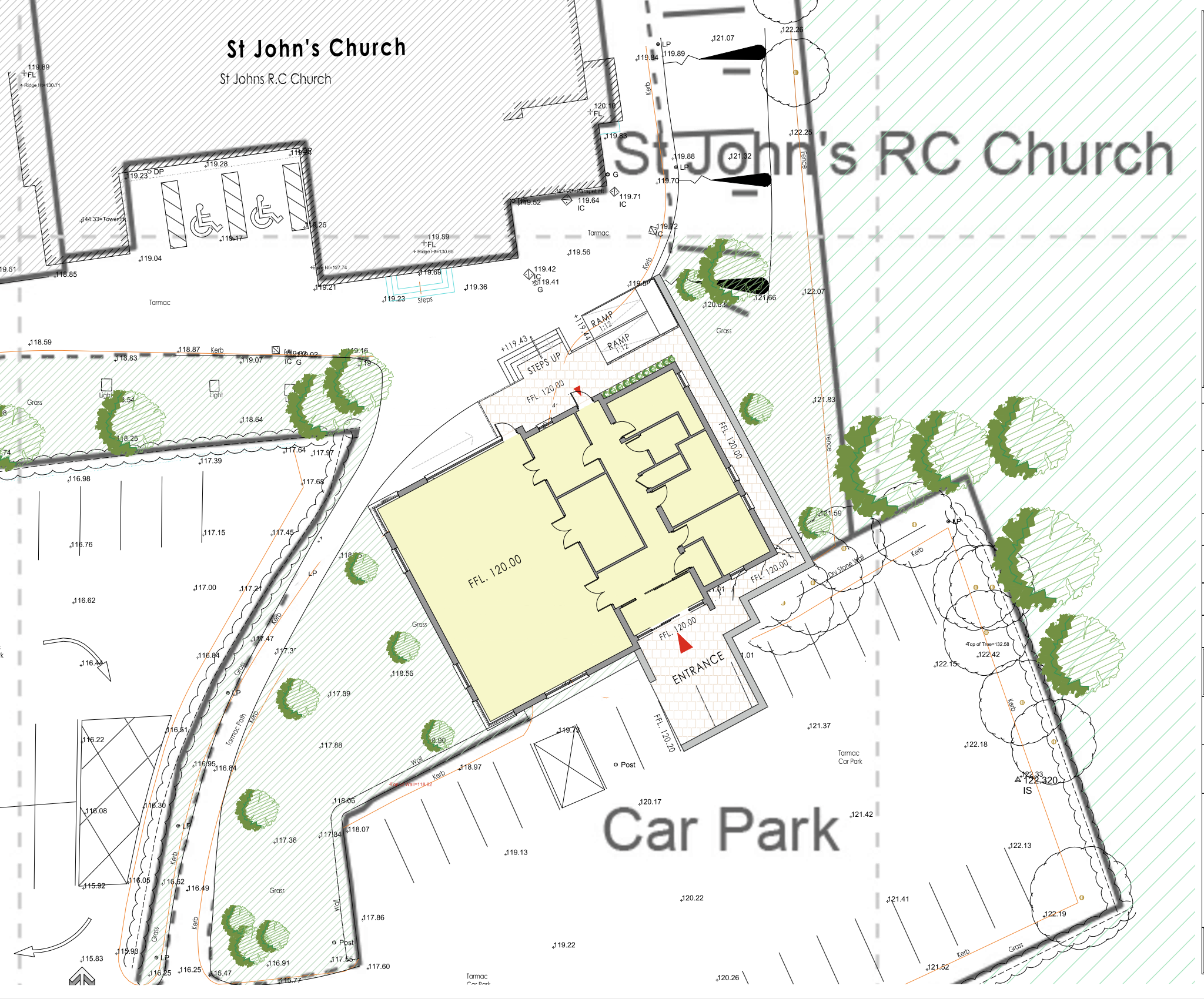 The drawings shown here set out proposals for future development within the parish. These plans include the replacement of the Parochial House, improvements to access and parking, and the creation of a new hall and meeting room for the benefit of the whole parish community.